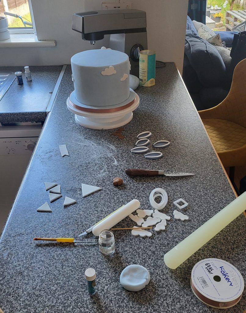 - Fondant Work. The cake is draped in a sky-blue fondant. My go-to fondant is Sugar Paste, you do have to work it this little bit harder to make it playable but the results are great. It has a great stretch and doesn’t break that easily, comparing to some other fondants I’ve worked with in the past, and is has a fantastic smooth finish. I hand-cut the clouds and decorative banners to give it a whimsical , “Up in the clouds” feel.
